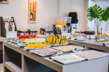 En el hotel pueden disfrutar de un desayuno buffet con pasteles, panecillos frescos y frutas tropicales.